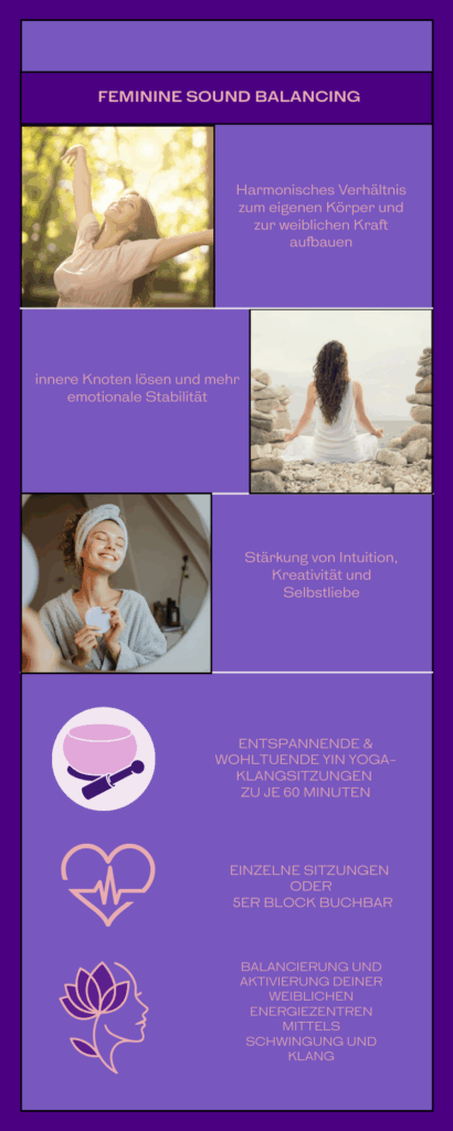 Feminine Sound Balancing ist eine ganzheitliche Methode zur Harmonisierung und Stärkung der weiblichen Energie durch gezielte Klangarbeit in Kombination mit individuell ausgewählten Yin Yoga Positionen.